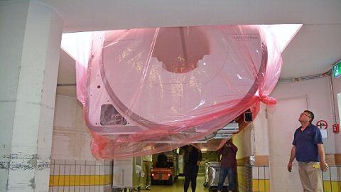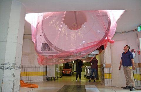 7,5 Tonnen hängen an der Kette. Vorsichtig bewegt der Mann im Führerhaus des Autokrans das 1,5 Millionen Euro teure Gerät abwärts. Mit ruhiger Hand manövriert er den brandneuen Magnetresonanztomografen durch eine extra dafür geöffnete Deckenplatte in den neuen Untersuchungsraum an der Klinik Hohe Warte. Es klappt. Maßarbeit. Und Aufatmen bei allen Beteiligten.