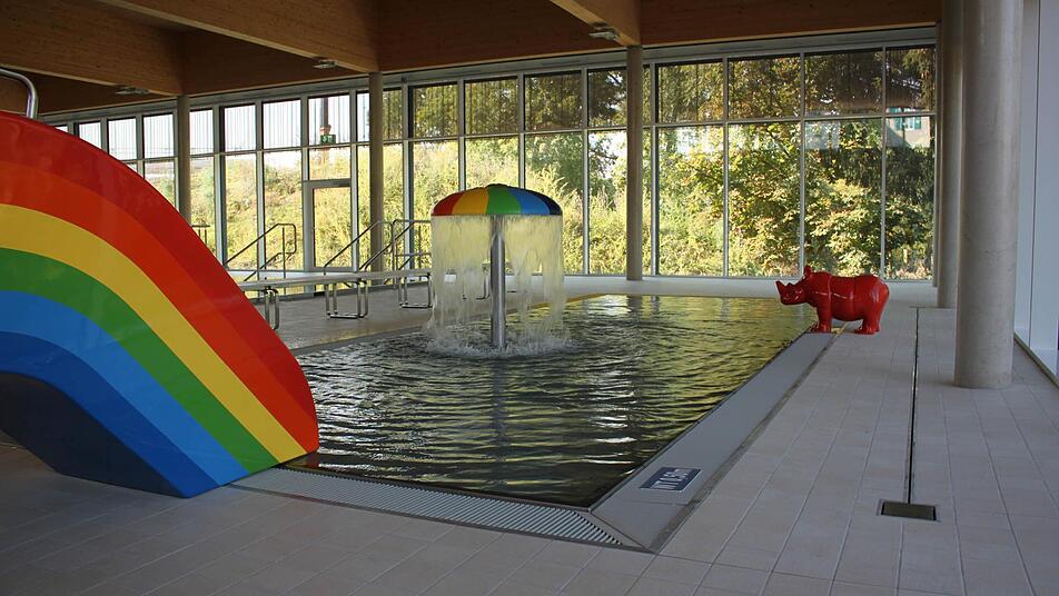 Deshalb ist auch das schöne Baby- und Kleinkinderbecken entstanden. Es hat zwei unterschiedliche Wassertiefen, so dass auch die Kleinsten das 33 Grad warme Wasser genießen können. Regen-Pilz, wasserspuckendes Nashorn und eine Rutsche wie ein Regenbogen mobilisieren den Nachwuchs. Ob die Eltern ihre Kinder da so schnell wieder heraus bekommen?