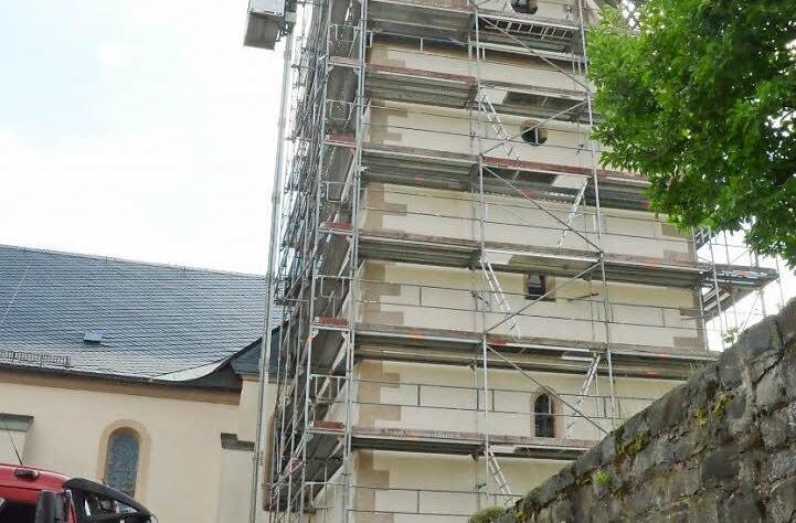 fassaDE Der alte Putz muss runter und ein neuer drauf: Der Turm von St.Bartholomäus in Rothenkirchen wird mit einem Kostenaufwand von rund 85 000 Euro saniert.