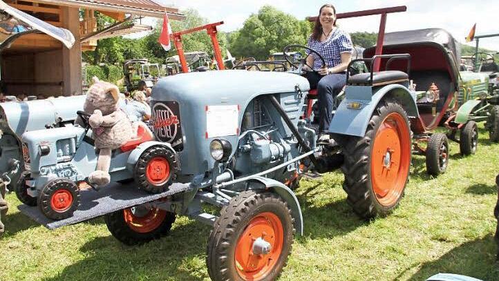 Manche Ackerrösser sind liebevoll herausgeputzt, anderen sieht man ihren täglichen Arbeitseinsatz an. Unter all den grünen und roten Traktoren sticht ein orangefarbener im hellen Sonnenlicht besonders heraus. Wie von Bäckermeister und Fahrer Josef Hofmann zu erfahren ist, handelt es sich bei dem Traktor um einen Allgaier Porsche mit Originallackierung. Da das Fahrzeug vorzugsweise im Straßenbau eingesetzt wurde, hat man es schon vom Werk aus orange lackiert.