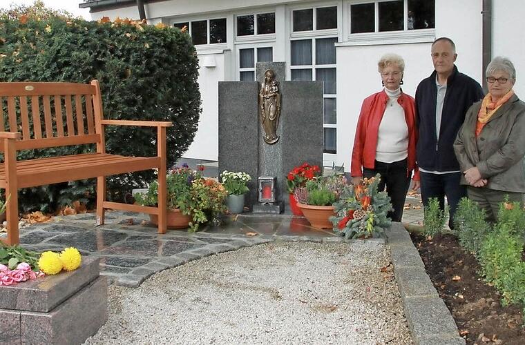 Neue Gestaltung Seit der Einweihung ist an dieser Stelle im Friedhof viel passiert. Die Einrahmung der Wiese, die Bank sowie die Gestaltung beider Steine wurden vom Gartenbauverein selbst verwirklicht. Die Mitglieder Peter Stündel und Georg Walter haben die Gedenksteine aus alten Steinresten selbst gestaltet. Vorsitzende Marlies Thiele ist sehr stolz, was in der letzten Zeit hier passiert ist, besonders auf den Gedenkstein mit der Madonna. Rund herum wurde alles gefließt und eine Bank aufgestellt. "Hier können die Angehörigen Blumen und Kerzen hinstellen.