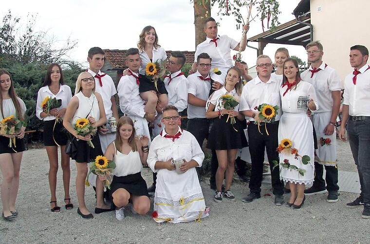 Kurz bevor der geschmückte Zweig weitergegeben werden konnte, erwischte es zur Freude der Paare Carina und Michael. Das Paar wurde auf die Schulter genommen, um anschließend mit Blasmusik zum obligatorischen Walzer ins Festzelt zu ziehen.