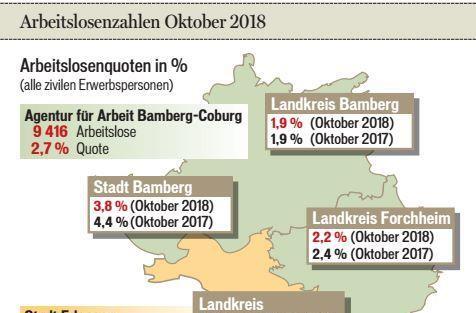Die Zahl der Arbeitslosen verringerte sich im Agenturbezirk Bamberg-Coburg, zu dem auch Stadt und Landkreis Forchheim gehören, im Oktober um 457 Personen (4,6 Prozent) auf 9416. Sie liegt nun wieder u...