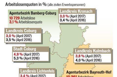 Allein im letzten Monat verringerte sich die Zahl der arbeitslosen Männer um 744 oder 11,3 Prozent. Die Tourismussaison steht vor der Tür. Daher profitieren jetzt auch die Frauen vom Frühjahrsaufschwung. Die Zahl der Arbeitslosen reduzierte sich im Landkreis Kronach gegenüber dem Vormonat um 211 Personen oder 15,4 Prozent. Kronach verzeichnet den größten Rückgang unter allen Kreisen im Agenturbezirk, da sich hier traditionell die saisonale Belebung am Arbeitsmarkt sehr stark auswirkt. Im April waren 1159 Personen beschäftigungslos gemeldet. Gegenüber dem Vorjahresmonat verringerte sich diese Zahl um 149 bzw. 11,4 Prozent. Die Arbeitslosenquote lag im Berichtsmonat bei 3,0 Prozent (Vorjahr 3,4 Prozent). Das ist die niedrigste Arbeitslosigkeit in einem April seit über einem Vierteljahrhundert.