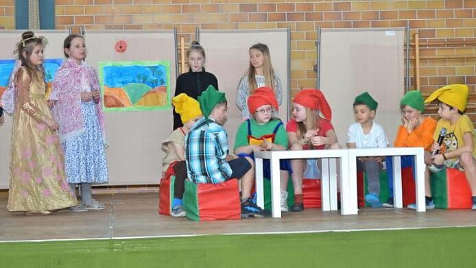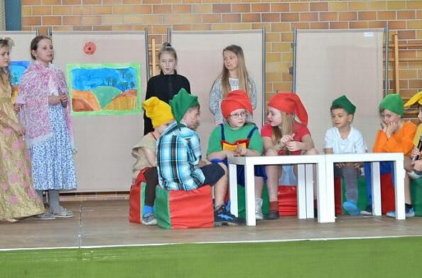 In wochenlangen Vorbereitungen und Proben hatten die Schüler der 3a-Ganztagsklasse mit Julia Knauer die lustige Märchengeschichte "Notruf aus dem Märchenland" einstudiert, unter Mitwirkung von Konrektorin Brigitte Roppelt und Förderlehrer Siegbert Jakob. Und nicht nur das: Auch die Kulissen wurden selbst gebastelt und während des Theaters von fleißigen Mitschülern auf der Bühne auf- und umgebaut. Da saß jeder Schritt und jeder Griff.