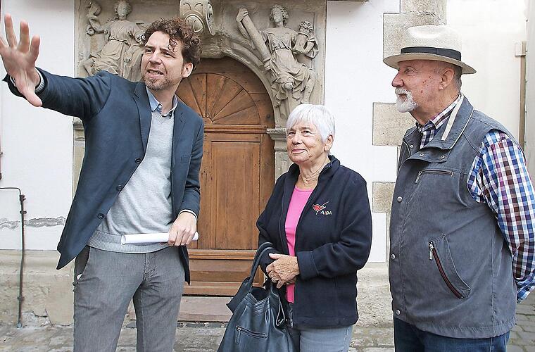 Kein Gedränge gab es am Eingang zum Museum im Deutschordensschloss, als Museumsleiter Nicolas Zenzen die Gäste zur Führung "der Deutsche Orden in Münnerstadt" begrüßte. Nur ein einziges Ehepaar interessierte sich für diese Veranstaltung des Henneberg-Museums zum Tag des offenen Denkmals. Die beiden waren keine Einheimischen, sondern vom Bodensee angereist. Ilse Riede hatte von ihrem Sohn zum 80. Geburtstag einen Besuch des Heimatspiels samt Kurzurlaub in Münnerstadt geschenkt bekommen. Das Geburtstagskind aus Konstanz hat viel Bezug zu Münnerstadt und zur Region. Ilse Riede, eine geborene Müller, stammt aus Unsleben, besuchte das alte Gymnasium in Münnerstadt und machte hier eine dreijährige Lehre bei Eisen-Krais. Später arbeitete sie im Büro bei Preh in Bad Neustadt. Ilse Riedes erster Ehemann starb noch jung mit 30 Jahren. Da sie dort Verwandte hatte, ging sie danach nach Konstanz und arbeitete unter anderem über 25 Jahre als Sekretärin in der Zentralredaktion der Tageszeitung Südkurier. Auch wenn er nur zwei Zuhörer hatte, nahm sich Nicolas Zenzen eine Stunde Zeit, um den Gästen die Geschichte des Deutschen Ordens in der Stadt nahezubringen.