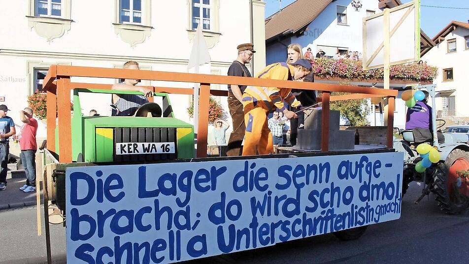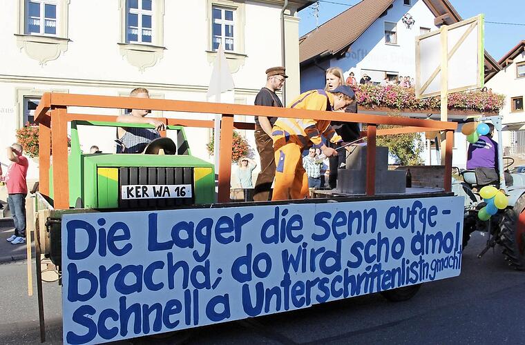 "Krawall im Stall", eine zerstörte Oberleitung mit totalem Telefonausfall in der Gemeinde, Pannen beim Baumaufstellen im letzten Jahr und schließlich ein zweifelhafter "Schwerlasttransport" waren die diesjährigen Themen. Dann wird alljährlich auch noch "die Kerwassau" ausgerufen. In diesem Jahr war es "Der Wanger" (hochdeutsch: Wagner), so der Spitzname des Burschen, der bei der Kerwa 2016 als erster blau war. Er durfte den Zug von einem Sautrog aus beobachten, nahm das Ganze aber sehr locker. Und natürlich - ohne dieses Thema wär's ja nur eine halbe Sach' - musste auch die Dorferneuerung herhalten. Besser gesagt, die beiden Lager, die sich in Wachenroth für und gegen die Verlegung der Staatsstraße gebildet und Unterschriften gesammelt haben.