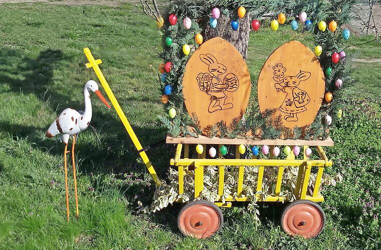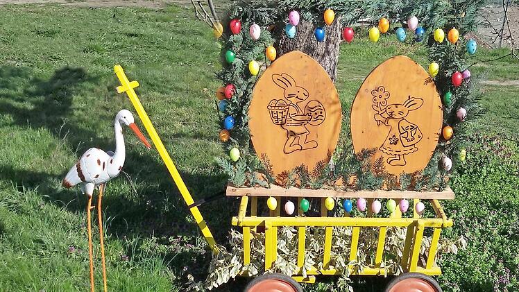 Der Michelauer Conny Laux stellte einen Ostergruß in seinen Garten. Es muss ja nicht immer der Osterbrunnen sein - ein Leiterwagen mit zwei großen Ostermotiven tut es auch. Der Storch passt trotz unüb...