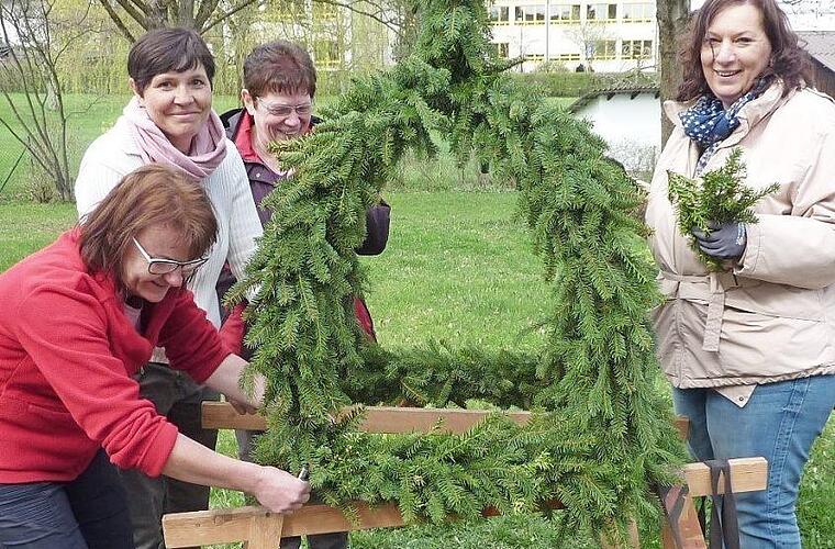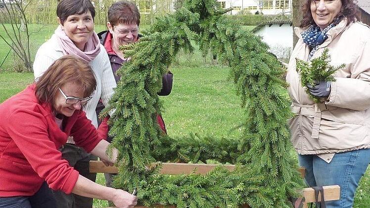 Die Frauen vom Obst- und Gartenbauverein Stockheim-Wolfersdorf haben wieder eine Osterkrone gebastelt, die nun den Außenbereich des Gotteshauses St. Wolfgang schmückt. Im Bild von links zu sehen sind Jeannette Oberkofler, Roswitha Schardt, Adelgunde Ramming und Sandra Brauer.