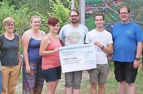 Dekanatsjugendseelsorger Christian Deuber übergab zusammen mit Jugendlichen die Spende an die Aischgründer Sozialeinrichtung mit der Bitte, dieses Geld dafür einzusetzen, "dass Bewohner der Laufer Mühle unterstützt und ausgebildet werden, damit sie später nach ihrer Therapie wieder mehr Chancen im Leben haben."