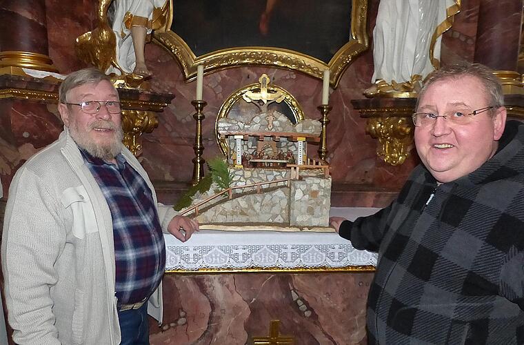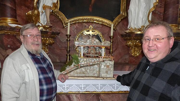 Fünf Jahre lang hat Bruno Tittel (im Bild, links) nach einer Darstellung des letzten Abendmahles Jesu Christi gesucht. "Erst bei der zurückliegenden 13. Krippenschau sagte mir Günther Kotschenreuther aus Stadtsteinach, dass er eine habe. Ich machte mich ans Werk und habe sie erst vor wenigen Tagen fertiggestellt", sagte Tittel, als er Pfarrer Pater Adrian Manderla (rechts) die Passionskrippe - auf einem Seitenaltar in der Wallfahrtskirche aufgestellt - übergab. Hier kann sie gerne betrachtet werden. Tittel machte sie der Kirche zum Geschenk, wofür sich Pfarrer Adrian herzlich bedankte. Foto: Klaus-Peter Wulf