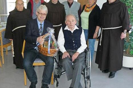 Im Februar des letzten Jahres siedelte Pater Hieronymus ins Dr.-Julius-Flierl-Senioren- und Pflegeheim des Bayerischen Roten Kreuzes in Marktleugast über, wo er sich liebevoll umsorgt sehr wohl fühlt. Fürs Haus gratulierte Josef Hofer zum Ehrentage. Die Glückwünsche der Marktgemeinde Marktleugast sprach Zweiter Bürgermeister Reiner Meisel zum 85. Wiegenfeste aus und hatte als Präsent einen Korb voller gesunder Säfte parat.