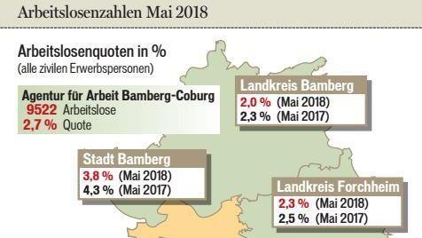 Im Erlanger Stadtgebiet waren im Mai 2348 Menschen arbeitslos gemeldet. Das sind 21 Personen oder 0,9 Prozent weniger als im Vormonat und 27 oder 1,1 Prozent weniger als vor einem Jahr. Die Arbeitslosenquote beträgt aktuell 3,7 Prozent und liegt damit im Vergleich zum Vor- und Vorjahresmonat um 0,2 Prozentpunkte niedriger.