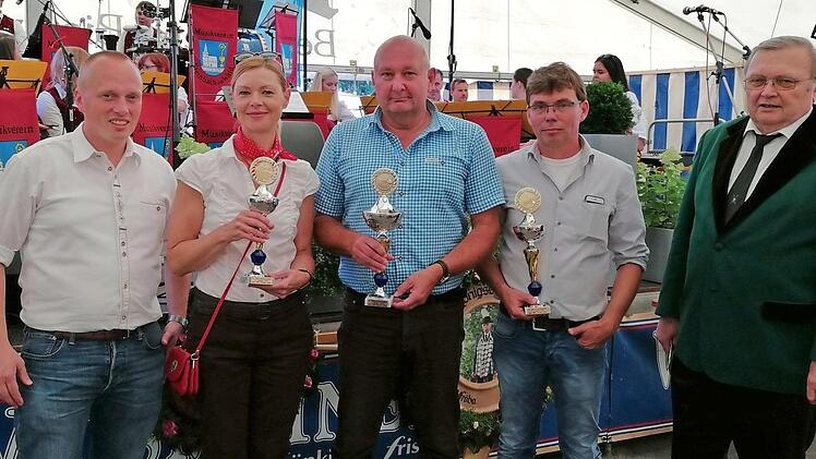 Der spannende Wettkampf fand in Bürgermeister Peter Ebertsch (Tettau) einen würdigen Sieger. Bürgermeister Thomas Löffler (von links im Bild) überreichte die Pokale an Grit Meusel (3. Platz), Peter Ebertsch (1. Platz) und Rudolf Fröba (2. Platz). Mit im Bild der Vorsitzende des SV Rennsteig Steinbach am Wald, Willy Fiedler. Foto: Karl-Heinz Hofmann