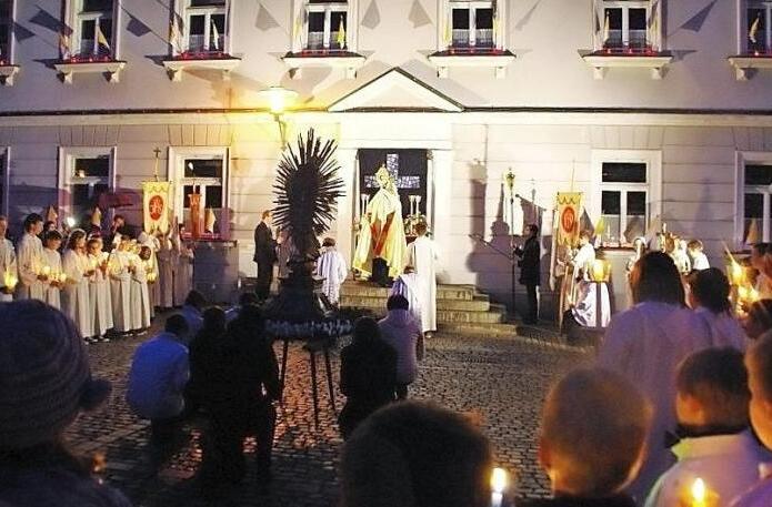 Mit etwas Glück konnte die traditionelle Lichterprozession der St.-Georgs-Pfarrei am Abend des Maifeiertages abgehalten werden. Viele Anwohner des Prozessionsweges schmückten nämlich trotz der unsicheren Witterung ihre Häuser mit brennenden Kerzen und sorgten so für ein stimmungsvolles Ambiente in der Altstadt. Die Freiwillige Feuerwehr garantierte durch die Straßenabsperrungen des veränderten Prozessionsweges einen reibungslosen Ablauf der Feier.