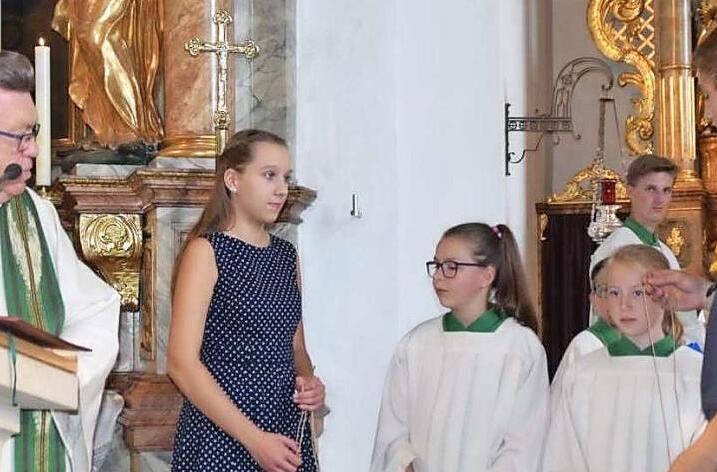 Döringstadt wurden Emma Lesch und Greta Wendler in die Schar der Messdiener aufgenommen. Die beiden Kommunionkinder erklärten sich bereit, den Dienst am Altar zu verrichten. Darüber freute sich auch Pfarrer Rudolf Scharf und wünschte ihnen viel Spaß und Freude bei ihrem Dienst. Die Oberministranten Moritz Sommer und Hanna Dörfler überreichten den beiden als Zeichen nach außen die Ministranten-Kreuze.