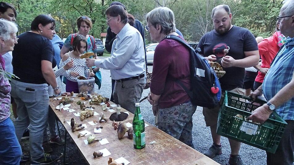Etwa 40 Pilzinteressenten nahmen an der Pilzexkursion zu den neunten Eberner Pilztagen teil. Pilzkundler Herbert Stang (Mitte) hatte alle Hände voll zu tun, um die zahlreichen Pilzarten zu bestimmen. ...