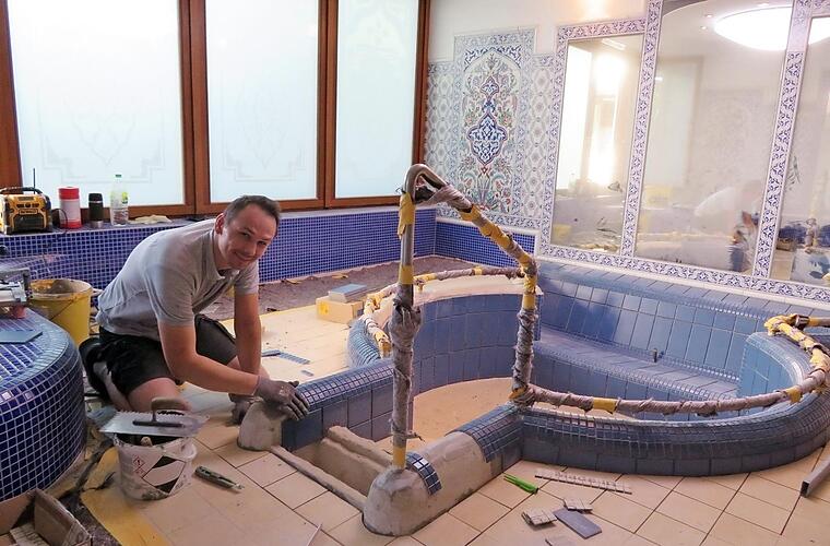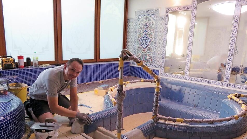 Die kleinen Mosaikfliesen wurden ausgetauscht, auch im Einstiegsbereich, die Beckenböden wurden komplett neu beschichtet. Nach dem Trocknen füllten die vier Mitarbeiter der Fachfirma aus dem mittelfränkischen Wendelstein die Becken erneut mit Wasser, um sie der Dichtigkeitsprüfung zu unterziehen.