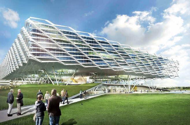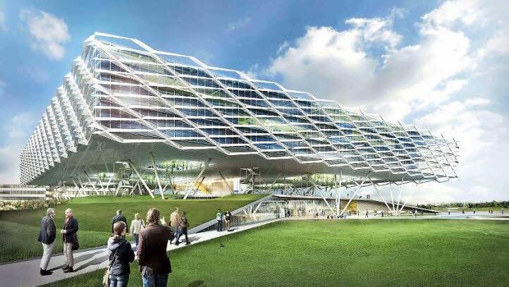 Künftige Haupteingang Der Entwurf von Behnisch Architekten aus Stuttgart wurde für das Bürogebäude Südost, dem zukünftigen Haupteingang der "World of Sports", einstimmig ausgewählt, da er sich durch seine Offenheit und Leichtigkeit außergewöhnlich gut mit der Dynamik des Sports verbinde, so das Unternehmen. Caramel Architekten aus Wien, die Zweitplatzierten, begeisterten mit einem revolutionären, hochflexiblen Raumkonzept und bekamen den Zuschlag für das Bürogebäude West.