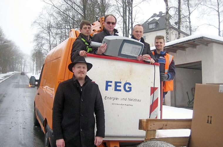 Steinbach am Wald setzt bei der Straßenbeleuchtung vollständig auf moderne und sparsame LED-Anlagen. Kurz vor dem Abschluss der Umrüstung hat sich Erster Bürgermeister Thomas Löffler zusammen mit Edgar Müller und Dominik Tschampel von der Bayernwerk Netz GmbH vor Ort ein Bild vom Erfolg der Maßnahme gemacht. In zwei Schritten wurden in sämtlichen Gemeimdeteilen bereits an mehr als 600 Brennstellen moderne und sparsame Leuchten installiert.