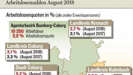 Im Landkreis Coburg stieg die Zahl der Arbeitslosen in den letzten vier Wochen um 100 (+6,8 Prozent) auf 1561. Seit August 2017 ist die Erwerbslosigkeit um 105 Personen oder 6,3 Prozent zurückgegangen. Vor allem junge Menschen meldeten sich verstärkt nach dem Ausbildungsende arbeitslos, da nicht immer ein nahtloser Übergang in eine neue Tätigkeit aufgrund der Ferienzeit möglich war. Die Zahl der arbeitslosen Jugendlichen und jungen Erwachsenen unter 25 Jahren erhöhte sich deswegen im abgelaufenen Monat um 34 oder 16,4 Prozent auf 241. Die Arbeitslosenquote stieg auf 3,1 Prozent (Vorjahr 3,3 Prozent). Der Arbeitgeberservice konnte in diesem Monat 205 sozialversicherungspflichtige Stellenangebote aus dem Landkreis entgegennehmen. Im Bestand gibt es aktuell 1219 Beschäftigungsperspektiven, 63 (+5,4 Prozent) mehr als im Vorjahr. red