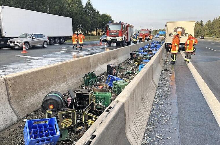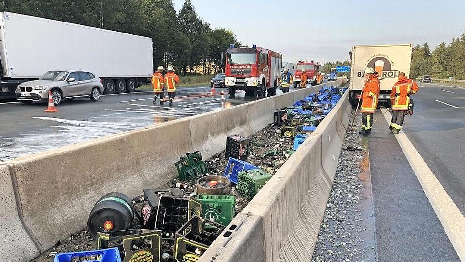 Nach dem Zusammenprall mit dem Hindernis verlor der Mann die Kontrolle über seinen Lastwagen und stieß gegen die linke Betonschutzwand. Dabei löste sich seine Ladung. Mehrere Kästen fränkisches Bier verteilten sich auf die Fahrbahnen in Richtung Berlin und Nürnberg. Der Leipziger blieb unverletzt.