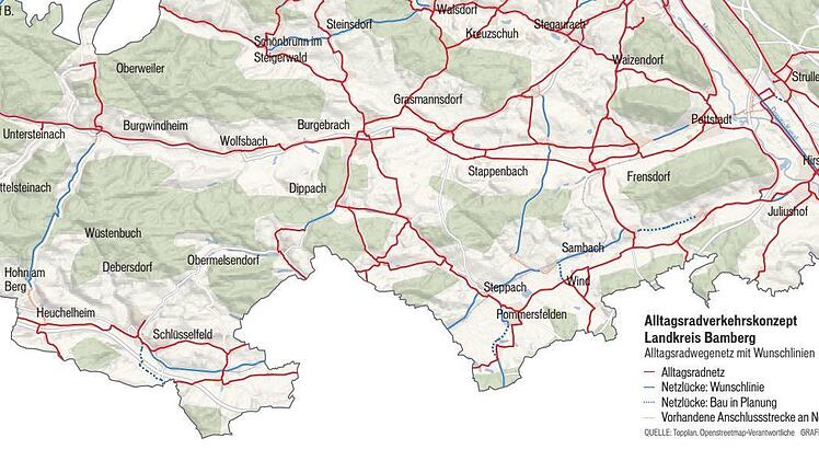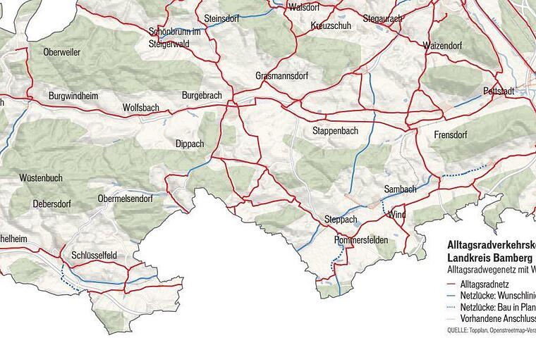Im Vergleich zu den benachbarten Flusstälern von Rauher Ebrach und Aurach weist das Radwegenetz entlang der Hauptverkehrsströme im Tal der Reichen Ebrach noch größere Lücken auf. Nach dem neuen Konzept für den Alltagsradverkehr im Landkreis Bamberg sollen diese in den kommenden Jahren geschlossen werden. Welche das sind, geht aus den Datenblättern hervor, die für jede Gemeinde konkrete Angaben zu den vom Büro Topplan zusammengestellten Vorschlägen enthalten.