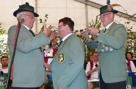 Ralf Rehder regiert das Schützenvolk in Presseck. Bei der Krönung durften ihn Schützenkommissar Stefan Sigmund und Erster Schützenmeister Frank Wunner erstmals mit der Hauptkönigskette schmücken. Ralf Rehder siegte mit einem 51,0-Teiler vor Frank Wunner (124,3).