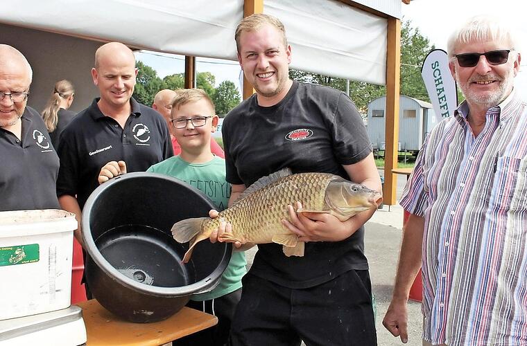 Falko Meier gewann ihn mit einem kapitalen Schuppenkarpfen, der ein Gewicht von 6360 Gramm auf die Waage brachte. Der große Karpfen hatte Falko Meier ziemlich zu schaffen gemacht. Jetzt wird er in das Fischwasser zurückgesetzt.