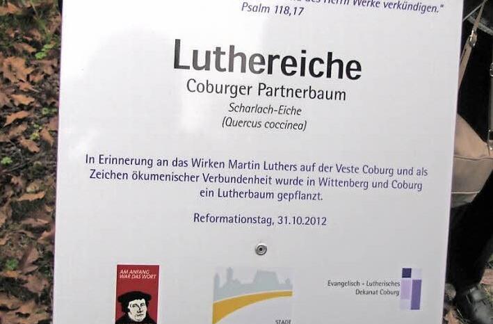 Coburg — Seit dem 13. April 2012 steht im Coburger Hofgarten eine Eiche, die in besonderer Weise an die Reformation und an das Wirken Martin Luthers in Coburg erinnern soll. Am Reformationstag, Freitag, 31. Oktober, weist eine Informationstafel auf die Bedeutung dieses Baumes hin, der geradewegs am sogenannten Lutherweg steht, der verschiedene Stätten der Reformation, vor allem in Sachsen, Sachsen-Anhalt, Thüringen und eben in Bayern miteinander verbindet. Speziell innerhalb Coburgs sind dies wohl vor allem die Veste Coburg, im Jahr 1530 ein gutes halbes Jahr lang der Wohn- und Arbeitsort des Reformators, und die Stadtpfarrkirche St.