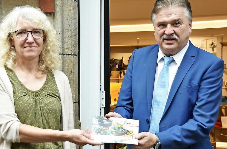 "Fair-Cooking - koche mit fairen, regionalen und ökologischen Zutaten." Das ist der Aufruf des Landkreises Kulmbach, den er jetzt in Form eines gedruckten Exemplars des Klima-Kochbuches untermauert. Rechtzeitig zur Fairen Woche 2021 überreichte Landrat Klaus Peter Söllner das "Faire Kochbuch" an den Weltladen in der Kulmbacher Fußgängerzone.