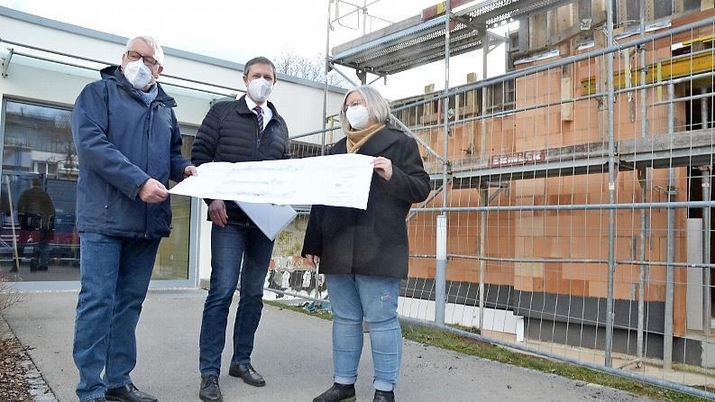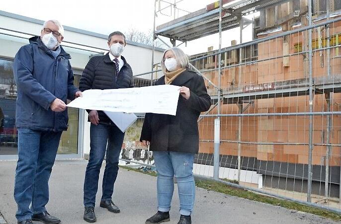 Der Anbau wird in massiver Bauweise ausgeführt, die sich in das Bild der bestehenden Gebäudeteile einfügt, erklärt Architekt Christian Wutke. Im Grunde ist der Anbau autonom, er wird aber an das bestehende Gebäude angebunden sein. Sein Kollege Markus Hanisch betont: "Wir arbeiten mit regionalen Firmen, die wir kennen und von denen wir wissen, dass wir gut mit ihnen zusammenarbeiten können. Die am weitesten entfernte Firma kommt aus einem Nachbarlandkreis", für ihn ein Grund, dass der Bau sowohl im Zeit- wie auch im Kostenrahmen plangerecht läuft. Im Herbst sollen die beiden Gruppen in den Anbau einziehen können. "Das Ziel ist natürlich, dass es mit Beginn des neuen Schul- und Kindergartenjahres klappt. Aber es ist auch möglich, eine Zeit noch zu überbrücken, wenn es nicht ganz klappt", sagt Marko Steiner. "Wenn uns nichts dazwischenkommt, dann sollte es zu schaffen sein", ist Christian Wutke zuversichtlich.