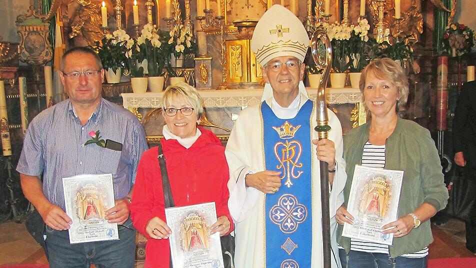 Danach wurden durch den Wallfahrtsseelsorger Pater Witalis Edeltraud Krappmann für 20, Marianne Krappmann für 30 und Reinhold Schmidt für 35 Wallfahren nach Marienweiher geehrt.