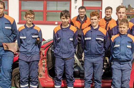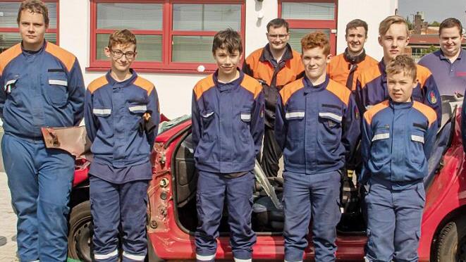 Nach der Mittagspause wurden die jungen Floriansjünger in der technischen Hilfeleistung theoretisch unterrichtet, bevor im Hof eingeklemmte Personen mit Hilfe von Rettungsschere und Spreizer aus einem Auto geborgen werden mussten.