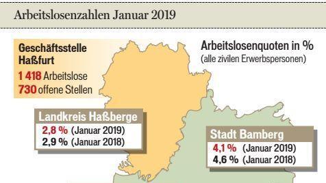 Die Arbeitslosigkeit ist im Landkreis Haßberge von Dezember 2018 auf Januar 2019 um 252 Personen auf 1418 Erwerbslose gestiegen. Die Agentur für Arbeit gab am Donnerstag diese und weitere Zahlen bekan...