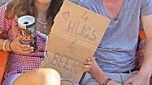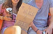 Not macht erfinderisch. Bei der Sandkerwa bewahrheitet sich das mal wieder aufs Trefflichste. Vor dem Alten Rathaus hat sich am Sonntag ein junges Trio aus der Oberpfalz und Mittelfranken niederlassen. Ihr Angebot, das sie auf einem Stück Karton den vorbeiströmenden Kerwa-Besuchern unterbreiten: "4 Hugs 4 Beer". Frei übersetzt würde das wohl heißen: "Für ein Bier kriegst vier Umarmungen!" Lag es an der Hitze? War der allgemeine Alkoholpegel noch zu niedrig? Ist dem Bamberger gar körperliche Nähe eher unangenehm? Jedenfalls wollte sich am Nachmittag keiner so recht auf das Geschäft einlassen. Die Drei trugen trotzdem ein breites Grinsen im Gesicht - vielleicht lag das auch daran, weil das erste Angebot auf der Rückseite des Kartons beim Weg zur Kerwa fast zu gut geklappt hatte: "Ihr hupt, wir saufen!"