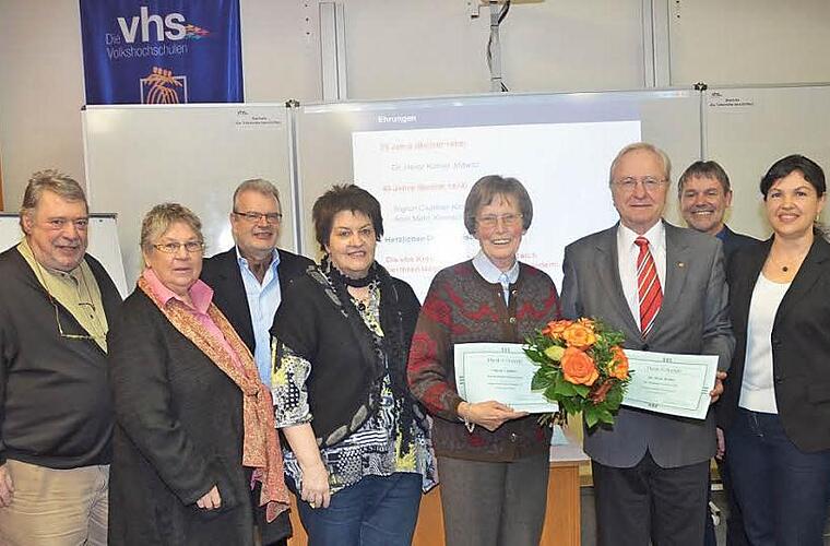 Vorsitzende Angela Hofmann ehrte langjährige treue Mitglieder und Mitarbeiter. Für 40 Jahre Mitgliedschaft wurden Sigrun Csallner und Anni Mehl geehrt. Altlandrat Heinz Köhler wurde für 25-jährige Mitgliedschaft gedankt. Von den Mitarbeitern ist Karin Zetzmann mit 30 Dienstjahren die Dienstälteste. Sein 25-jähriges Dienstjubiläum feierte der pädagogische Mitarbeiter Christian Franz und Elvira Kunz ist bereits seit 20 Jahren in Diensten der VHS Kronach.