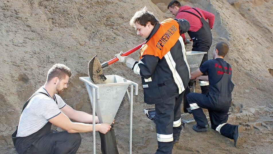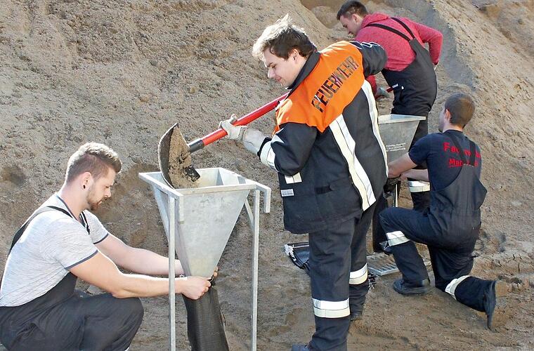 Feuerwehrleute aus dem Landkreis übten fleißig, wie man Sandsäcke richtig und ausreichend befüllt.