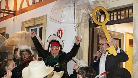 Bürgermeister Helmut Krämer wurde von den Cowboys und Indianern sofort umzingelt und vor die Tür gezogen. Mit erhobenen Händen musste er einen Kriegstanz über sich ergehen lassen. Dann forderte die Meute den Schlüssel und die Geldtruhe heraus.