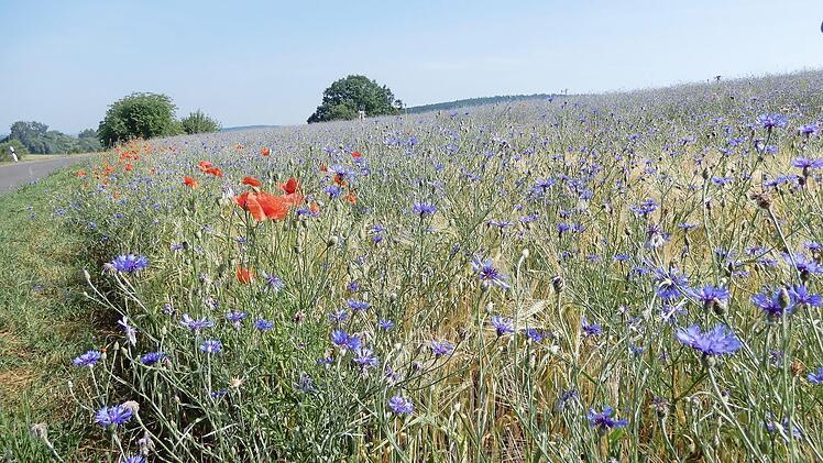 Wer in diesen Tagen von Ebern nach Lind auf der Gemeindestraße kommt, entdeckt auf einem großen Feld kurz vor dem Rentweinsdorfer Gemeindeteil fast so etwas wie ein Naturwunder. Linker Hand fällt dem aufmerksamen Betrachter ein riesiges Feld mit Kornblumen auf. Das Feld erhält durch den dort zusätzlich scharlachrot blühenden Klatsch-Mohn ein tolles Gepräge. Für alle Natur- und Blumenfreunde ein herrlicher Anblick. Dabei macht die angesäte Gerste nur einen ganz geringen Teil im Feld aus. Die bearbeitende Familie, die Landwirtschaft im Nebenerwerb betreibt, nimmt es gelassen: So haben die Vorbeifahrenden ihre Freude und Bienen und Insekten entsprechende Nahrung. Foto: Horst Schneider