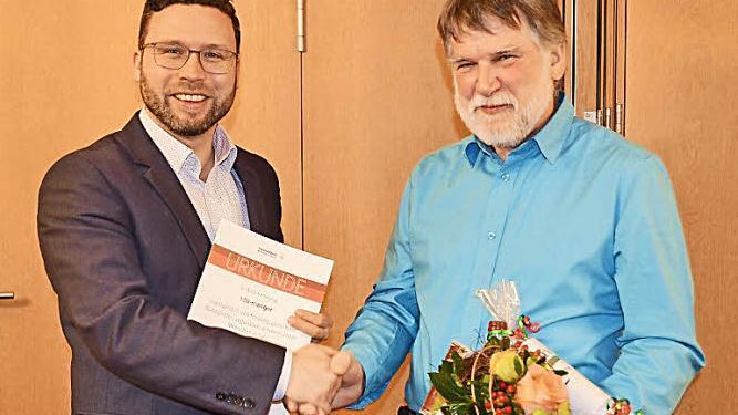 Dies gibt es nicht oft: Auf stolze 150 Blutspenden kann Ulrich Baudler (rechts) aus Ahorn verweisen. Dafür wurde er von Bürgermeister Martin Finzel (parteilos) in der jüngsten Sitzung des Gemeinderates geehrt. Foto: Gabi Bertram