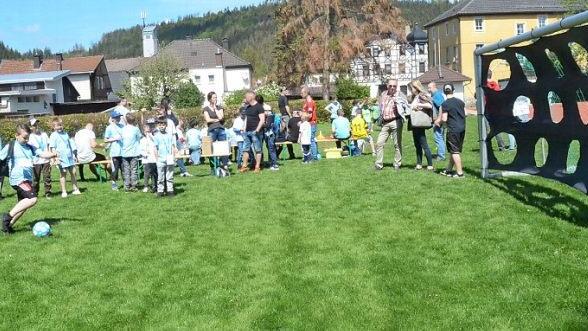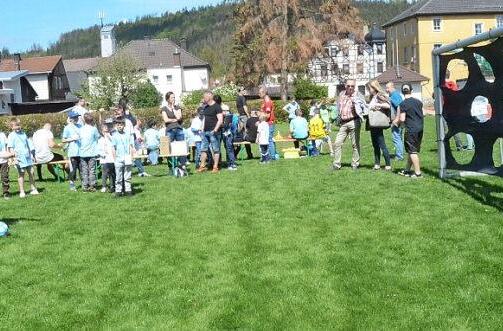 Die Grund- und Mittelschule Pressig feierte ein buntes und lustiges Schulfest mit Sport, Sozialem, kreativen Spielen, Musik, Tanz Theater und Ausstellungen. Parallel dazu lief auf dem Sportgelände die Aktion "Ballhelden" (Foto) in Zusammenarbeit zwischen Bayerischen Lehrerinnen- und Lehrerverband (BLLV) und Bayerischem Fußballverband (BFV). Über 100 Grundschüler nahmen an der Aktion teil. Deren Ziel ist es, Freude am Fußball mit sozialem Engagement zu verbinden. Kinder können Ballhelden werden und mit ihrer Begeisterung für Fußball anderen Kindern in Not helfen, indem sie Punkte sammeln, für die sie Erwachsene aus ihrem Umfeld für eine kleine Spende gewinnen.    Foto: K.- H. Hofmann