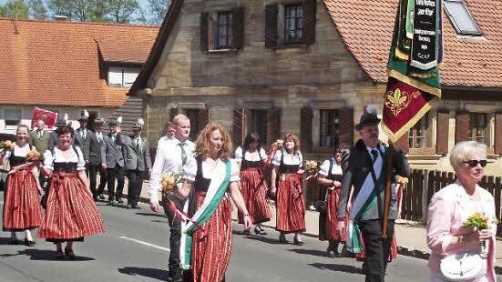 Nach beiden Seiten durch die ortsansässige Feuerwehr gut abgesichert, setzte sich der Zug durch die Ortschaft unmittelbar darauf in Bewegung. Unter der Begleitung zahlreicher Musikkapellen defilierten Schützen und Schützinnen, Blumendamen und Hochdekorierte sowie Vertreter des Gemeinderates an den zurückgrüßenden Gästen und Dorfbewohnern vorbei. Nicht zu beneiden waren die Träger der schweren Traditionsfahnen bei immer wieder aufkommenden Brisen. Ziel des Festzuges bildete die Mehrzweckhalle, wo mit Gewehrsalut durch die SG Herzogenaurach und anschließendem gemütlichen Beisammensein dem Schlusspunkt zugefeiert wurde: der Proklamation der Schützenkönige mit Preisverteilung.