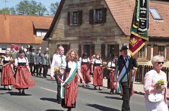 Nach Kirchenzug und Frühschoppen mit Musik wurde am nördlichen Ortsrand der Festzug aufgestellt, zu dem sich wieder etliche ortsansässige, benachbarte und befreundete Vereine einfanden.