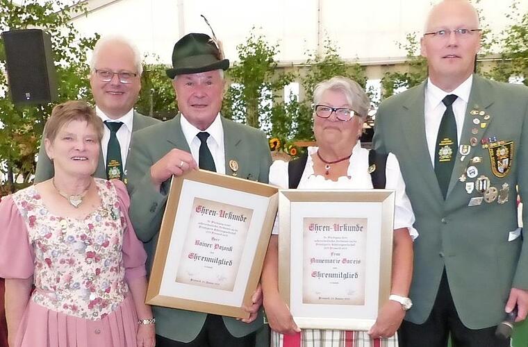 1. Schützenmeister Frank Wunner und Schützenkommissar Stefan Sigmund verliehen zwei besondere Ehrungen. In Würdigung ihrer außerordentlichen Verdienste und ihres unermüdlichen Engagements erhielten Annemarie Gareis und Rainer Pajonk die Ehrenmitgliedschaft. "Unsere Annemarie ist seit 1985 und damit 33 Jahre Mitglied unserer Gesellschaft. An der Seite unseres Ehrenschützenmeisters Werner Gareis war und ist Annemarie Gareis aus unserer Schützengesellschaft nicht wegzudenken. Es wird in der Gareis-Ära keine Veranstaltung oder Fest gegeben haben, an dem unsere Anne nicht beteiligt war", betonte Wunner.