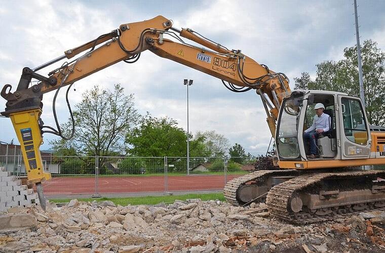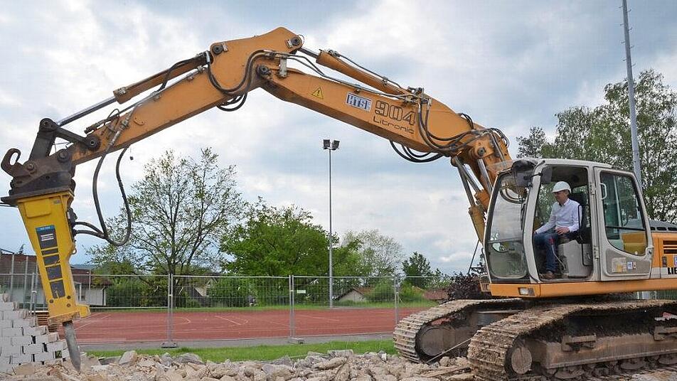 Bürgermeister Marco Steiner (FW) durfte persönlich den Abrissbagger bedienen, um symbolisch die Generalsanierung der Grundschule in Einberg zu beginnen. Tatsächlich hatten die Bauarbeiter schon vor diesem ersten "Spatenstich" mit dem zweiten großen Bauprojekt der Stadt neben der noch laufenden Generalsanierung der Mittelschule begonnen. Doch in den kommenden Wochen soll es mit Hochdruck weitergehen.