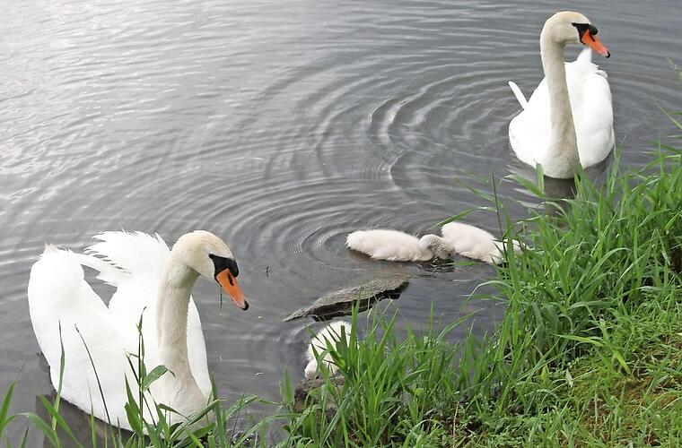 Die Schwanenfamilie genießt ihren Ausflug auf dem Main. Zwischen den Alttieren fühlen sich die Jungen wohl und sicher. Unser Bild entstand auf dem Fluss bei Eltmann, der eine Heimat für viele Wasservögel ist. Foto: Günther Geiling