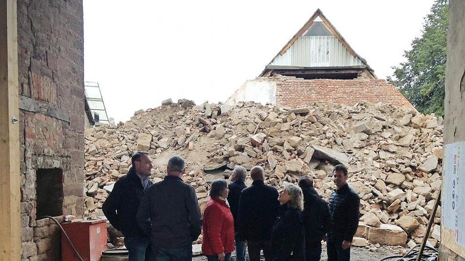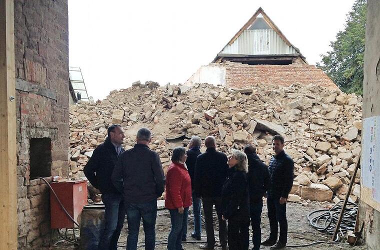 Ein weiterer Punkt war das Projekt "Schwarzer Adler" in Westheim. Das leer stehende ehemalige Gasthaus, das unter Denkmalschutz steht, wird saniert und in ein Dorf- und Gemeinschaftshaus umfunktioniert. Der Spatenstich für das mit 2,6 Millionen Euro veranschlagte Projekt fand Ende August statt. Das Gremium konnte sich beim Ortstermin einen Eindruck vom Baufortschritt machen. Bei den bereits erfolgten Abbrucharbeiten eines Nebengebäudes wurde ein altes Kellergewölbe mit einer Treppe freigelegt. Jetzt geht es an die Entkernung des Hauptgebäudes. Im Obergeschoss ist der geplante Veranstaltungsraum bereits zu erahnen.