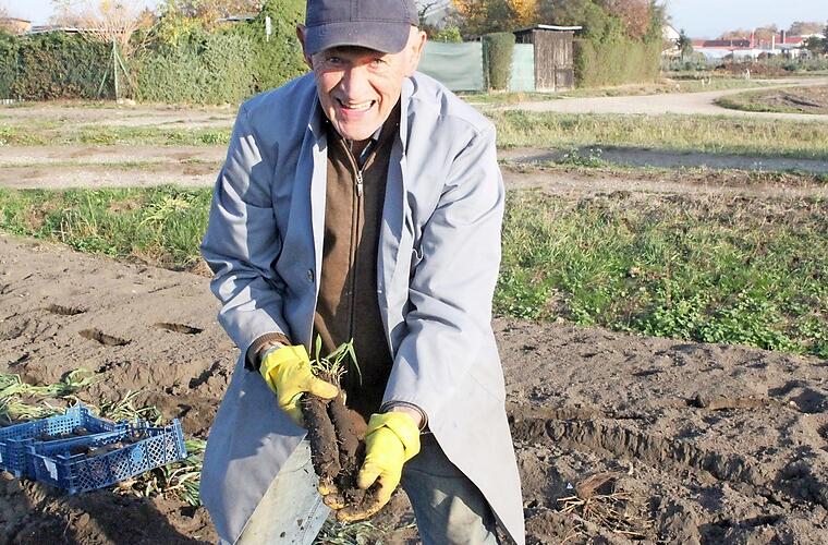 Zuerst wird der Boden gepflügt, der im Idealfall locker und sandig ist. Dann setzt Georg Demuth das Grabeisen an. "Heuer brauche ich auch einen Spaten, weil der Boden so trocken ist", erklärt der 78 Jahre alte Gärtner. Nachdem er dann die Wurzeln am Strang aus dem Boden gezogen hat, schneidet er die Blätter mit einem Messer ab und legt die schwarzen Knollen, die heuer besonders dick geworden sind, in eine Kiste zum Abtransport. Die harte Arbeit geht noch eine Weile weiter: Der Schwarzwurz wird von Oktober bis April angeboten.