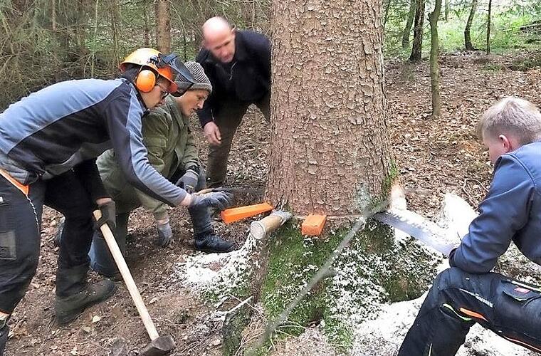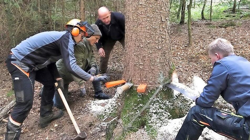 Unter fachkundiger Anleitung und Beobachtung von Wolfgang Schirmer (der auch Geschäftsführer der Waldbesitzervereinigung Kronach-Rothenkirchen ist) und Tobias Rebhan wurde der Baum in Handarbeit, traditionell mit der Ziehsäge, gefällt. Jedem war schnell klar: So eine Baumfällaktion ist keine leichte Arbeit. Und es gehört einiges Wissen dazu, damit der 25 Meter hohe Riese in die richtige Richtung fällt. Mit einem großen Rumms beim Aufprall auf den Boden und lautem Krachen und Knarzen der Äste kam der Koloss zu Fall.